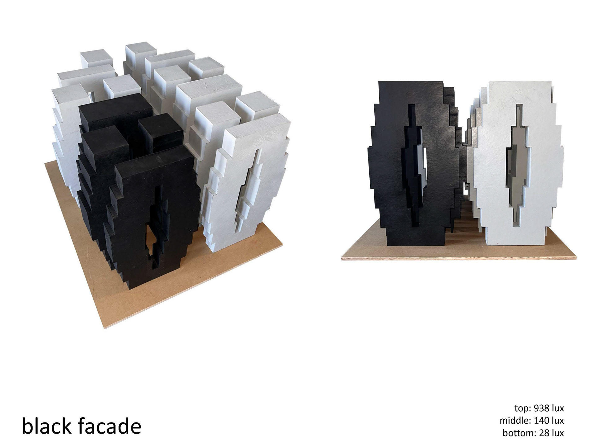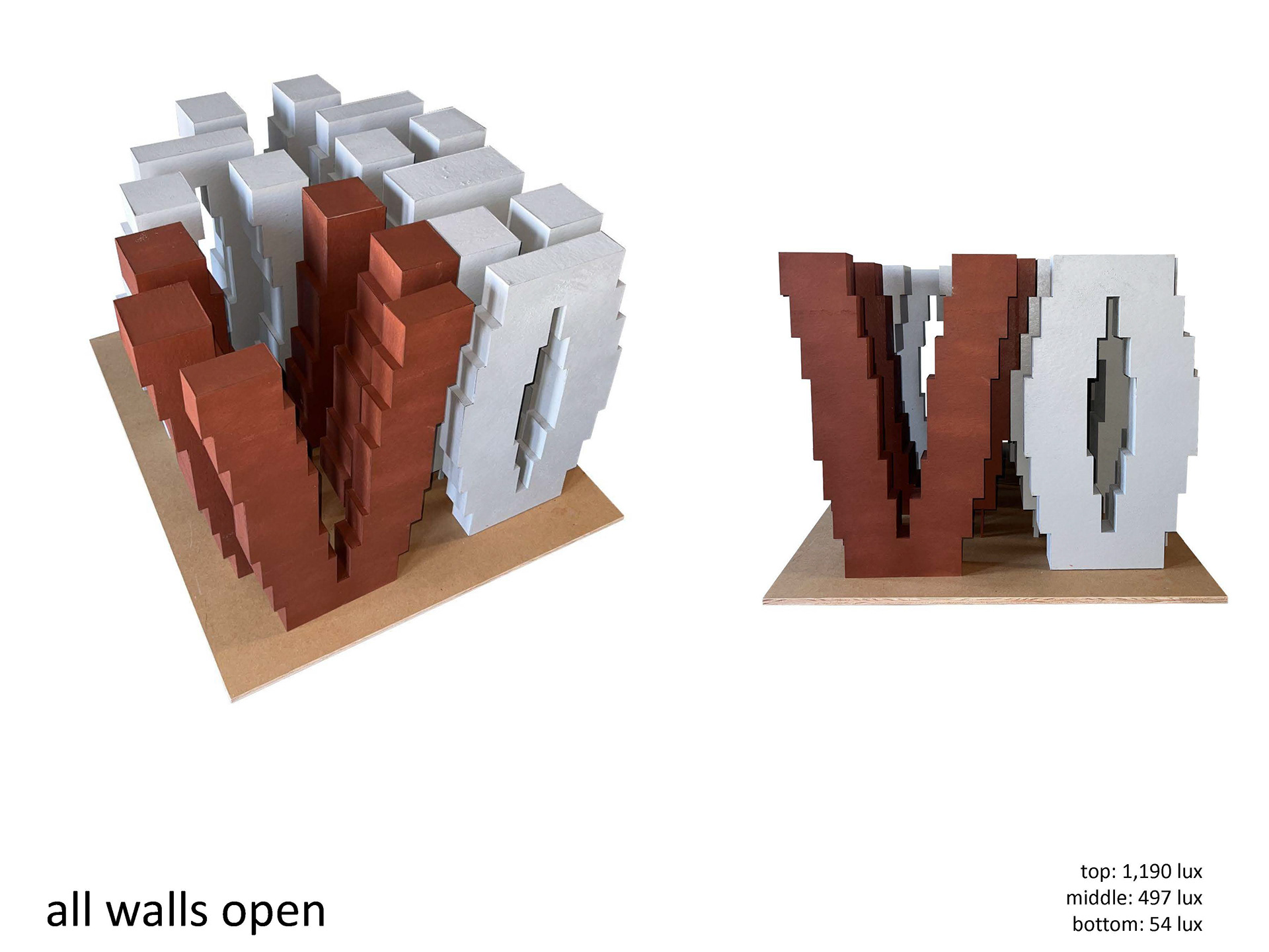 Our initial thought was simple: if we make the hole at the top of the towers bigger and included a color/ materiality with greater reflectivity that the space would have more light. What we were not anticipating to find was not only the quantitative data that could back up this claim would reveal different results than expected, but also that the formal differences we proposed in the towers' sectional layout were crucial in changing how light interacted in the spaces within the vertical courtyards.